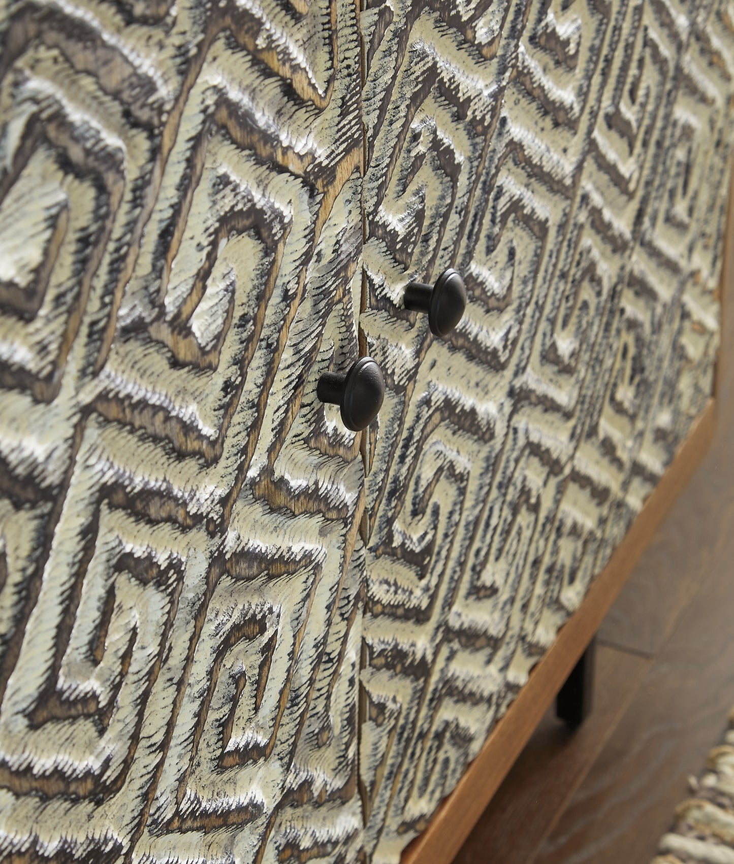 Details | Made of wood and engineered wood, Natural, black and ivory finishes, 3 doors with geometric carving and black metal knobs, 3 shelves, Cutouts for wire management, Assembly required | |