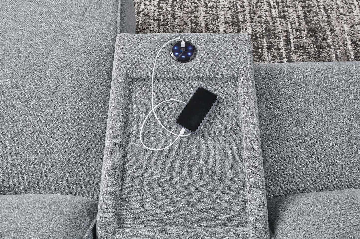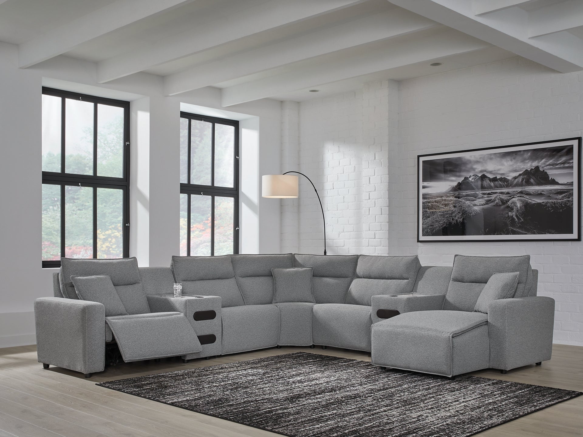 Details | Includes 7 modular pieces: left-arm facing power recliner, power armless recliner, armless chair, wedge, 2 consoles with audio systems and right-arm facing power reclining back chaise, "Left-arm" and "right-arm" describe the position of the arm when you face the piece, Versatile modular pieces fit together in a variety of configurations, One-touch power control with adjustable positions, Easy View™ adjustable headrest and zero-draw USB port, Zero-draw technology only consumes power when the USB receptacle is in use, Corner-blocked frame with metal reinforced seat; attached seat and back cushions; high-quality foam cushions wrapped in poly fiber, Polyester upholstery; Next-Gen Nuvella™ is a family-friendly fabric that is soft, easy to clean, stain-resistant and durable, Clean fabric with mild soap and water, let air dry; for stubborn stains, use a solution of 4 oz. bleach to 28 oz. water, Throw pillows with easy-to-remove zippered covers for machine washing; pillows with soft polyfill, Console with plexiglass top; built-in audio sound system with wireless connectivity; audio controls located on console; USB charging, Zero wall recliner design requires minimal space between wall and chair back, Power cord included; UL Listed | |