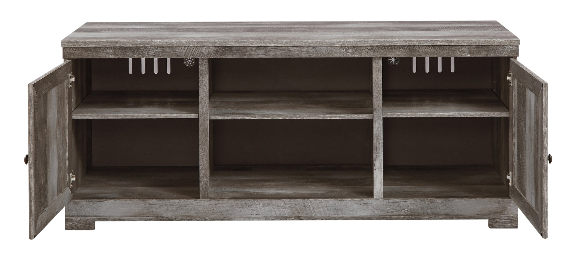 This entertainment center is sure to win your heart with its daring designer take on modern rustic. Its crisp, clean and minimalist-chic profile is enriched with a striking replicated oak grain with thick plank styling and a weathered gray finish for that much more authentic character. Crossbuck detailing adds a brilliant barn door inspired touch, while LED overhead lighting and glass shelving invite you to artfully put home accents on display.